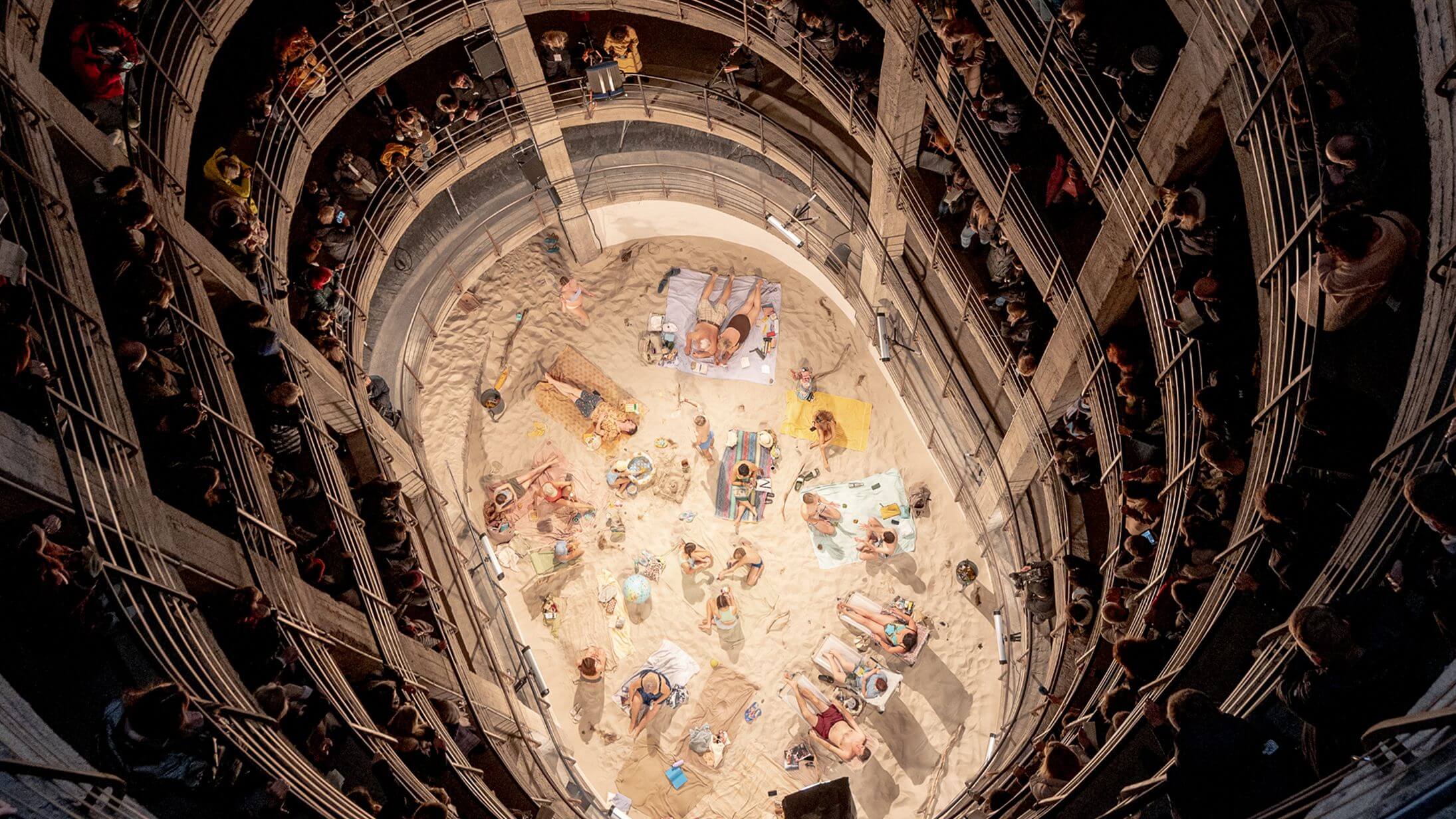 Sun & Sea는 백사장을 그대로 실내에 구현한 몰입형 오페라 퍼포먼스로, 관람객은 위에서 바라보며 퍼포머들의 일상을 감상합니다. 환경 문제와 인간의 일상, 여름의 덧없음을 유머와 음악으로 표현한 작품입니다.